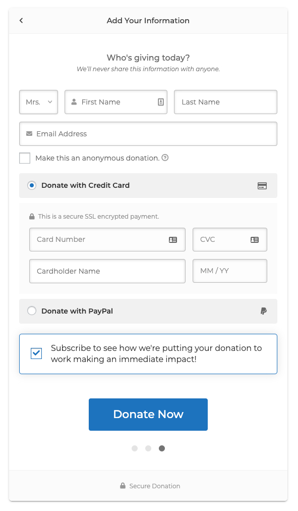 - Modern opt-in look and donor experience encouraging opt-ins.