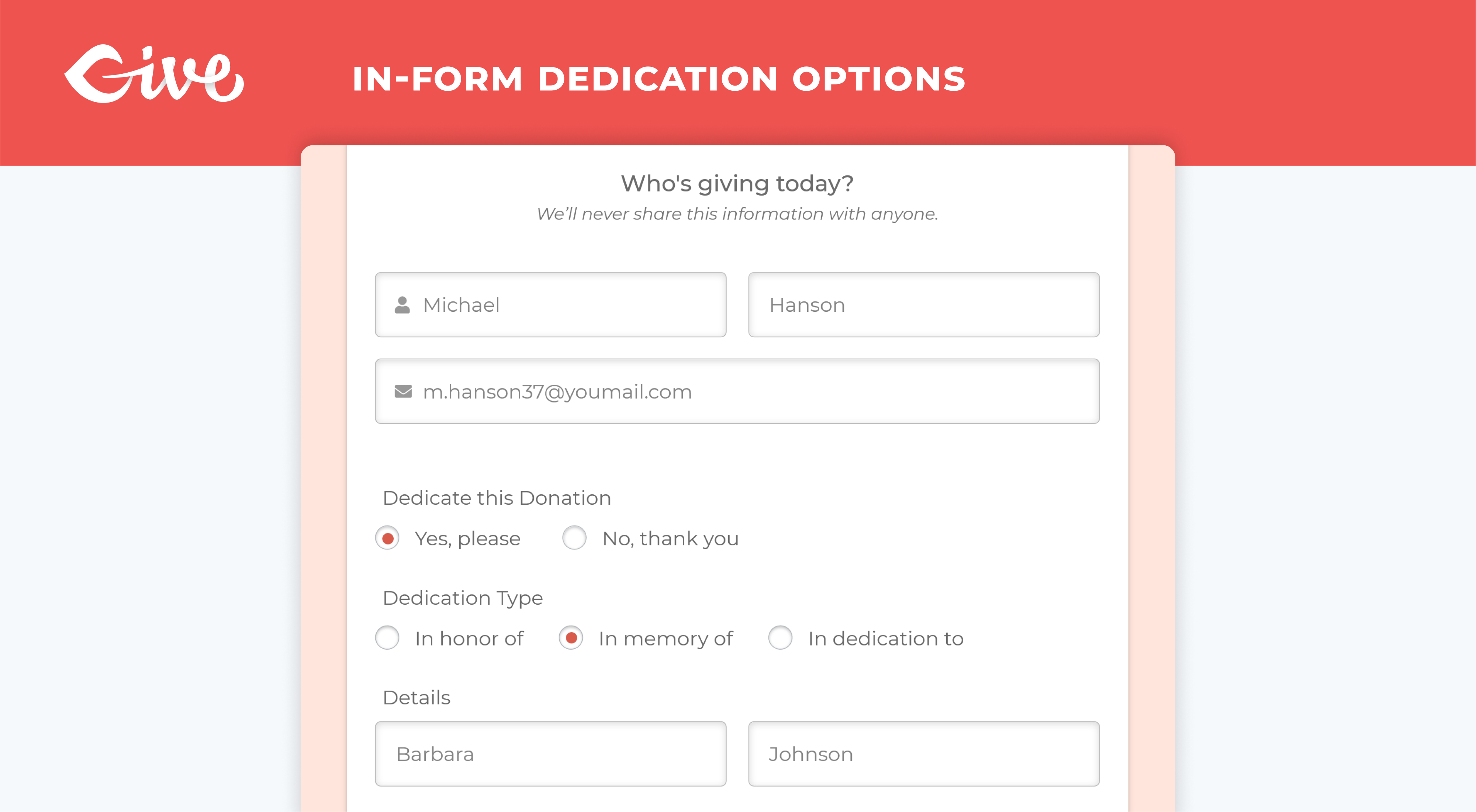 Many donors are moved to give in honor or in memory of a loved one. As well, donors may want to give on behalf of someone or in support of an event. By offering your donors the choice to give in tribute of someone or something, they will be more likely to donate to your cause.